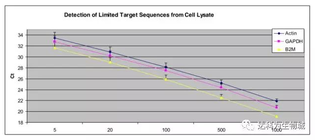 隨著HeLa細胞數的增加,分別用適量細胞裂解液裂解細胞后進行反轉錄,而后在7700 PCR儀上進行Actin、GAPDH和B2M基因的3復孔qPCR反應。