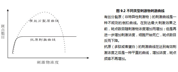 其一、非特異性的刺激物刺激效果不穩定。如圖9.2所示,非特異性的刺激物(有絲分裂原Mitogen)的刺激曲線幾乎沒有平坦的部分。也就是說,刺激物的濃度有細微變化,馬上就會體現在刺激斑點數目的變化上了,這樣實驗結果很難完全重現。相反,抗原的刺激曲線非常平坦,只要達到有效刺激濃度,斑點頻率就不再變化。