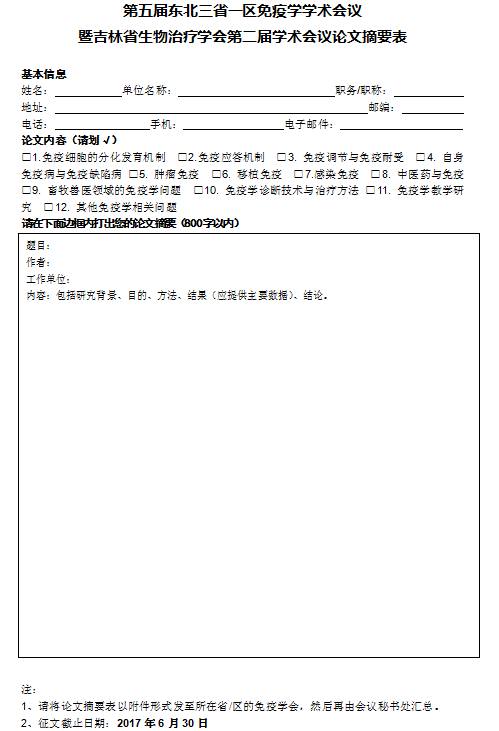 請于2017年6月30日前將“論文摘要表”發送至所在省/區的免疫學會,然后再由會議秘書處匯總。